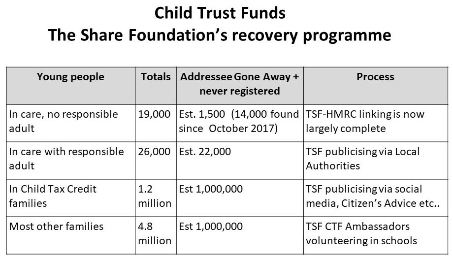 The Share Foundation is undertaking a major recovery campaign for the Child Trust Fund, a Government-funded account provided for over six million children and young people in the United Kingdom. This presentation is particularly designed for organisations which might be able and willing to help us re-link c. two million accounts lost to the young people concerned, almost all from disadvantaged backgrounds.