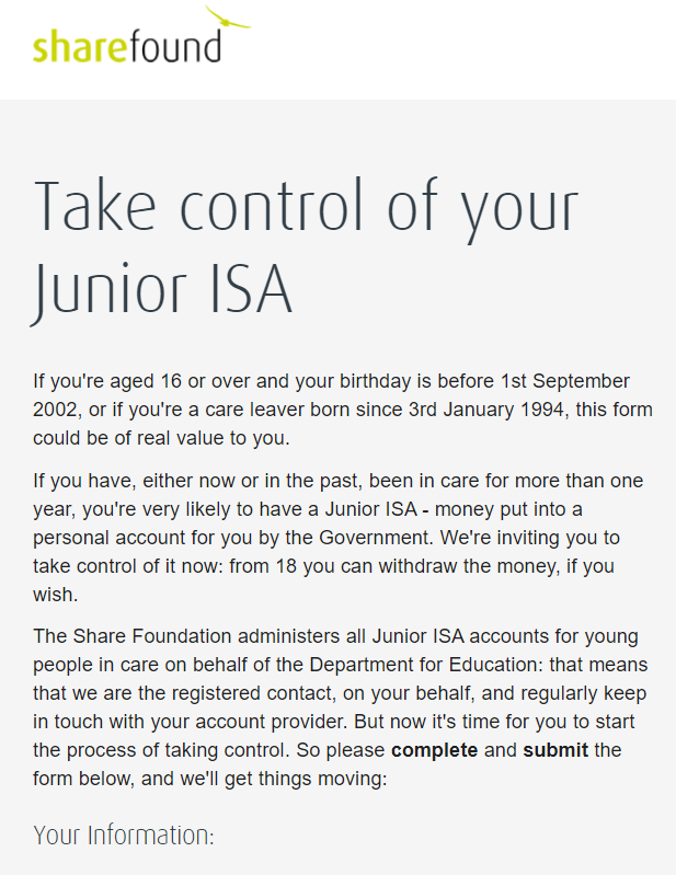 If you've been in care continuously for more than one year and do not have a Child Trust Fund, you will almost certainly have a Junior ISA. It's a pot of money put into an account for you personally by the government via The Share Foundation.